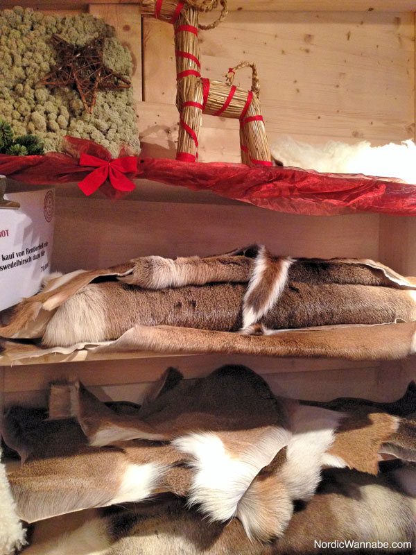 Nach dem Essen kann man noch einen Glögi (Glühwein) trinken. Ich kann Euch leider nicht berichten, wie der schmeckt, weil ich mich extrem vor diesen Bechern auf Weihnachtsmärkten ekel. 🙂 Mich zog es zu den kleinen Holzhütten. Wie gerne hätte ich ein Rentierfell. Das fühlt sich sehr weich an. Aber ich muss mich da noch etwas informieren. Denn die Qualität muss stimmen, ansonsten haart das Fell. Ein Rentierfell gibt es für 139,00 Euro.
