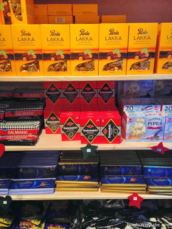 In der dritten Hütte gibt es viele Köstlichkeiten, wie Lakritz (Salmiakki), Glögi, Pfefferkuchen, Schokolade, und und und.. Wer mal was Süßes aus Finnland sucht, ist hier richtig: