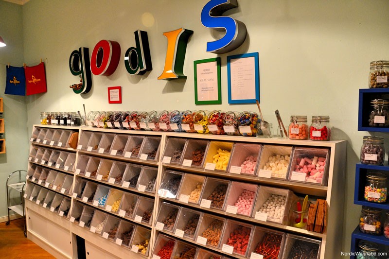 Links und rechts an der Wand stehen Regale, die bis oben voll sind mit schwedischen Süßigkeiten. Es ist unglaublich: Lakritz, Fruchtgummi, Schaumzucker, Salmiak und Dragees.