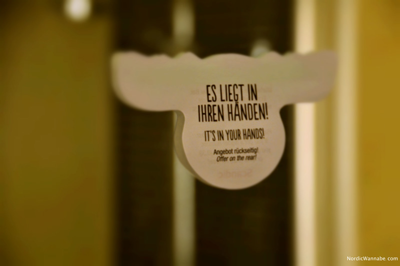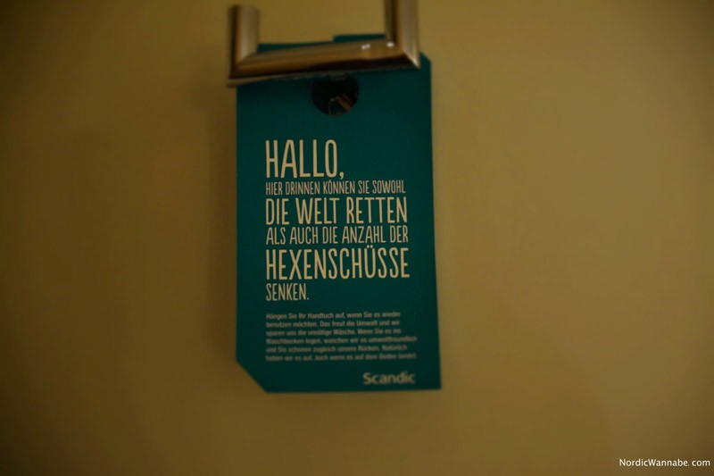 Zur weiteren Ausstattung der Superior Zimmer zählen Fön, Flachbildfernseher, kostenloser WLAN-Internetzugang, Klimaanlage, Minibar (Getränke inklusive), Safe und ein Direktwahltelefon mit Anrufbeantworter. Außerdem gibt es einen Wasserkocher zum Kaffee- und Teeköchen zubereiten sowie Bügeleisen und Bügelbrett. Sehr innovativ ist die Mülltrennung. Sehr cool. Sehr innovativ ist auch die typische Beschreibung für schmutzige Handtücher: „Hallo, hier drinnen können Sie sowohl die Welt retten als auch die Anzahl der Hexenschüsse senken.“ Wer kennt es nicht: Im Hotel soll man schmutzige Handtücher immer auf den Boden schmeißen. Warum soll sich das Zimmerpersonal extra beugen? In Scandic Hotel werden schmutzige Handtücher ins Waschbecken gelegt. So kann man die Anzahl der Hexenschüsse reduzieren. Tolle Idee!