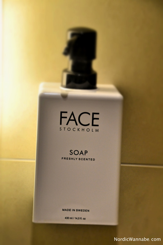 Das Badezimmer ist einfach ein Traum. Schön groß, sauber, tolles Lichtkonzept und eine wunderbare Regendusche. Am Spiegel hing ein Elch-Zettel mit der Info, dass man an der Bar gegen den Barkeeper spielen und was gewinnen kann. Die Seife kommt natürlich aus Stockholm. Der Vergrößerungsspiegel ist für die weiblichen Hotelgäste sicherlich ein Add-on und das Farbdesign ist einfach mega harmonisch. Das einzig (!) negative Detail in diesem Zimmer waren diese Gläser. Ich weiß, dass aus Umweltgründen sie besser sind als Plastikbecher. Aber ich weiß ja nie, ob diese Gläser wirklich gewechselt wurden und ob die sauber sind. Wenn man beispielsweise duscht, beschlagen sie. Ansonsten ist alles perfekt.