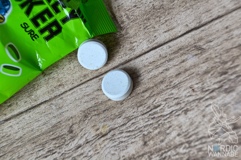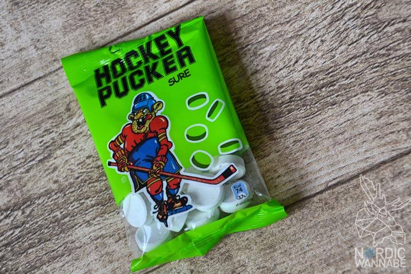 Sportlich geht es zu bei den HOCKEY PUCKER. Sie gibt es in vielen Sorten: sauer, mit Lakritz- und Cola-geschmack. Es sind so kleine runde, flache Drops. Ähnlich wie Tabletten. Sie sind hart und zergehen erst im Mund. 100 Gramm haben 370 Kilokalorien. Diese Version hier ist sehr sauer. Mit Ihrer Form erinnern sie doch sehr stark an kleine Pucks vom Eis-Hockey. Vorne auf der Verpackung ist auch ein Hockey-Spieler zu sehen. Produziert werden sie von TotteGott in Schweden.