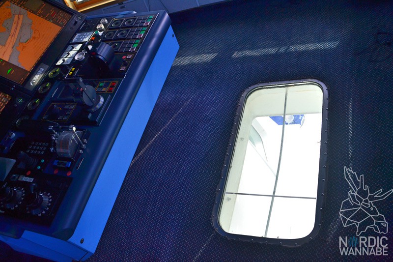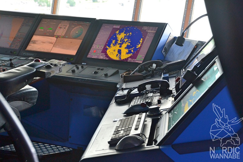 Wir durften exklusiv beim Auslaufen aus Göteborg auf die Brücke und den Kapitän Joakim Sjöberg bei der Arbeit beobachten. Hier bekommt Ihr eine Panorama-Ansicht von der Brücke: