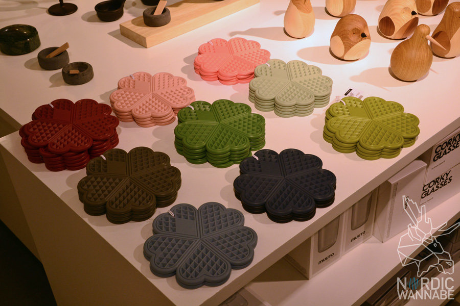 Doch meine Neugier hat mich gepackt und ich möchte so viele Produkte, wie möglich kennenlernen. Ich bin gespannt, was Norwegen so zu bieten hat in Sachen Design. In der Mitte des Stores ist eine große weiße Präsentationsfläche mit tollen bunten Waffeln aus Silikon, die als Topfuntersetzer oder Topflappen dienen. Die „Vaffel“ von Bark Bazar gibt für 199,00 Kronen. Wenn sie nicht so teuer wären, hätte ich glatt welche mitgenommen zum Verlosen. Aber sie sehen trotzdem cool aus. Ein Must-have für Norwegen-Fans, oder?