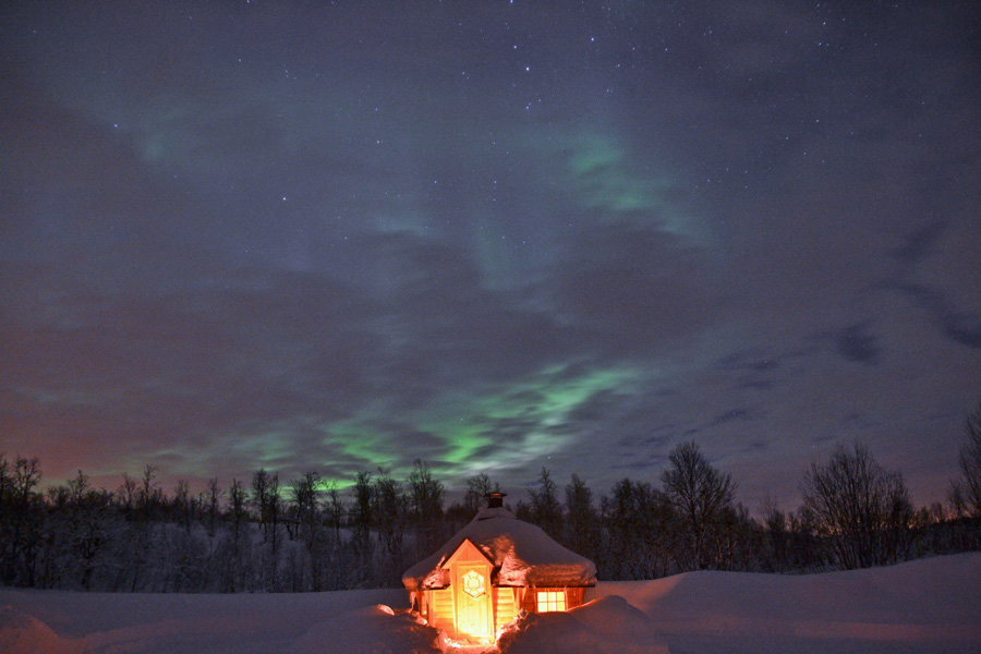 Ich weiß nicht genau, wo wir waren, aber wir fuhren in Richtung Narvik. Nach 1,5 Stunden kamen wir endlich an der Base-Station an. Hier passierte auch wieder etwas merkwürdiges. Jemand fuhr mit dem Wagen den Weg zur Station hoch und hatte hinten die Heißgetränke im Kofferraum. Der war aber offen und der Behälter fiel in den Schnee. Naja. Ohne Worte. Die Station war mitten im Nichts. Hier gab es nur Toiletten und zwei Holzhütten. Aber das ist perfekt zum Fotografieren, weil es so dunkel ist. Der Himmel war bewölkt und meine Hoffnung Nordlichter zu sehen, sank auf Null. Wir stellen alle unsere Stative auf, denn ohne kann man keine Nordlichter fotografieren. Ich hatte auch in meiner Naivität gedacht, dass ich mit dem iPhone Fotos machen kann, aber das kann man vergessen. Hehe. Wir gingen zum Aufwärmen ins Haus. Dort gab es Rentiersuppe. Wir mussten aber dafür irgendeinen Schein haben zum abgeben, aber den hatten wir nicht und man konnte uns auch nicht erklären, ob wir das mit bezahlt hatten oder nicht. Plötzlich rief der Guide: „Rauskommen, da sind Nordlichter!“