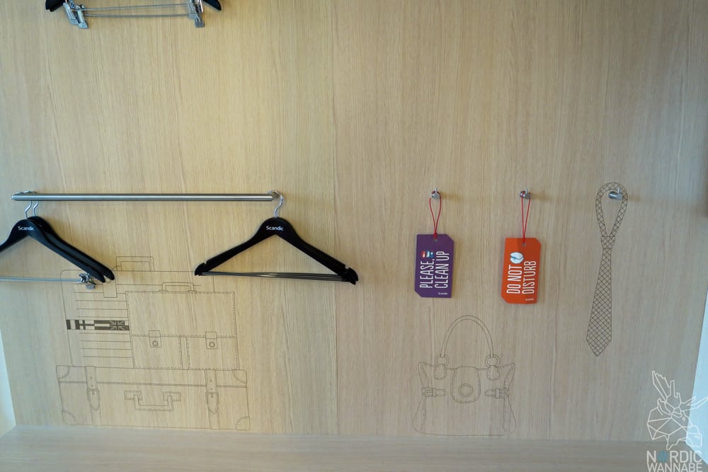 Das Bett ist sehr bequem und auch die Kissen und Decken machen einen ordentlichen Eindruck. Was ich sehr wichtig finde, sind Steckdosen neben dem Bett. Denn ich brauche immer Steckdosen, um mein Handy nachts aufzuladen. Und weil das Smartphone auch mein Wecker ist, bringt es nichts, wenn die Steckdose ganz weit ist. Hier im Scandic gibt es die Steckdosen am Bett – super! Stauraum für Wäsche und Koffer gibt es auch. Am Schreibtisch kann man die wichtigsten Büro-Aufgaben erledigen und den Müll trennen. Der Boden ist übrigens aus Echtholz, es gibt einen LED-Fernseher und einen Safe. Ach, das Hotel ist einfach super. Zur Begrüßung bekam ich ein kleines Anschreiben: