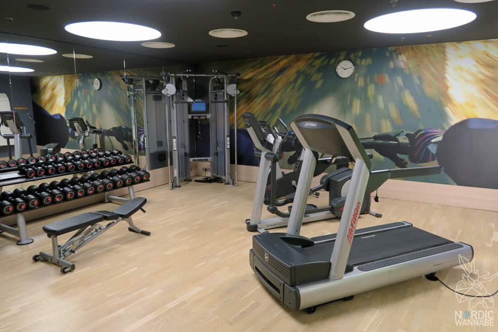 Irgendwie muss ich blind gewesen sein, als ich im Internet mir das Hotel angeschaut habe vorab. Und ich war nicht auf der Scandic-Webseite – vielleicht war das der Fehler. Ansonsten hätte ich sofort gemerkt, dass man dort auch Sportgeräte und Sauna nutzen kann. Leider hatte ich am zweiten Tag keine Zeit mehr das für Euch zu testen. Aber vielleicht beim nächsten Mal dann. Trotzdem habe ich mich in den Bereich geschlichen und Ihr könnt ja sehen, dass alles total sauber ist und wunderschön gestaltet. Ach schade, dass ich das vorher nicht gesehen habe. Ich habe das zufällig nur im Fahrstuhl gelesen und dachte: „Was? Ach schade.“ Also wenn Ihr mal in dem Hotel seid, müsst Ihr unbedingt Sport machen oder eine Runde saunieren.