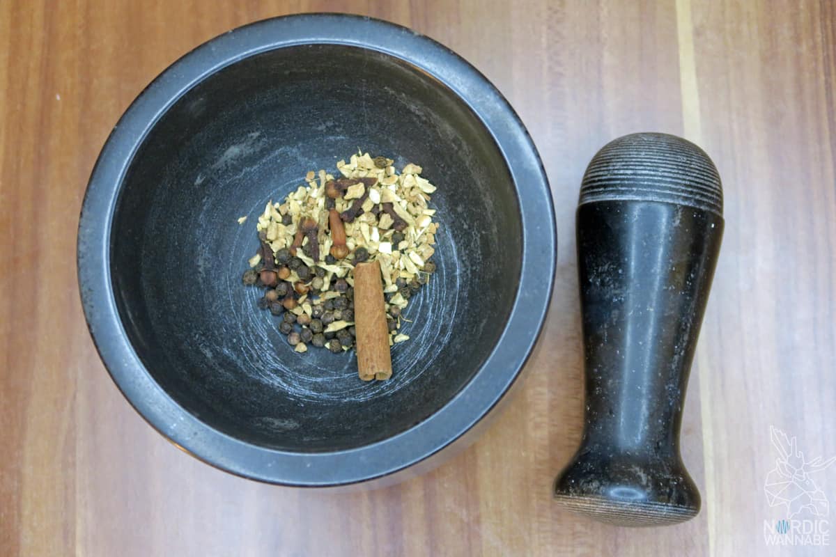 Jetzt kommt es darauf an, ob Ihr fertig gemahlene Gewürze nehmt oder sie selbst im Mörser zerkleinert. Denn am Ende müssen die Gewürze gemahlen sein.