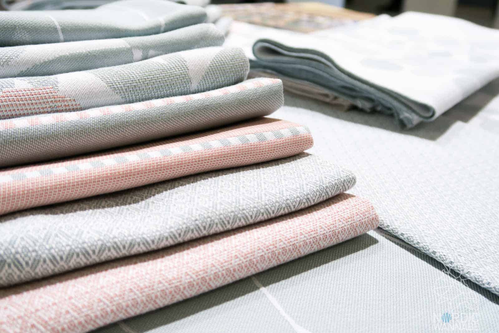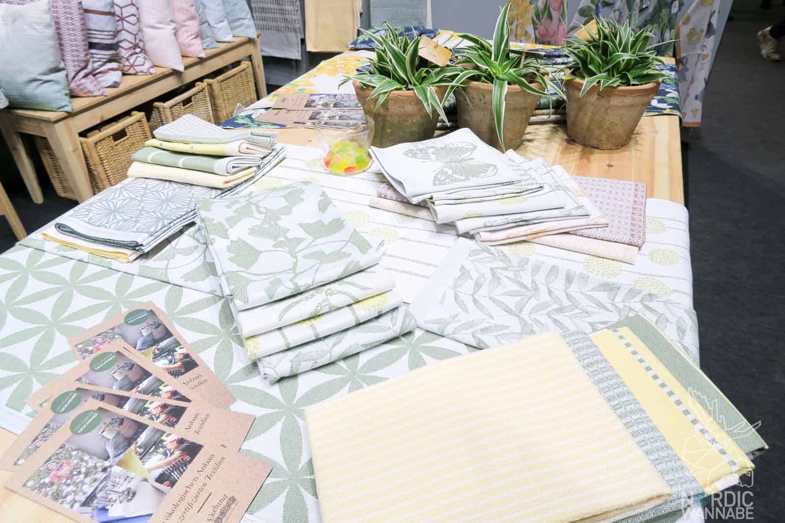 Es gibt vier Bereiche: Die Country House-Kollektion mit hellen Pastellfarben. Doch mir persönlich gefällt die Country House Collection (Scandinavian Version) noch viel mehr. Das Design erinnert mich total an Island, an raue Natur- einfach ein Traum. Dazu gehört zum Beispiel die graue Decke. Bei Boat House ist es maritim und da mag ich das Geschirrtuch mit den Walen. (Hab ich leider nicht fotografiert). Bei „Green House“ ist alles grün/gelb in der Farbwelt mit Vögeln, Insekten und Blättern. „Calm House“ überzeugt mit symmetrischen Mustern in grau, beige und rostbraun. Toll! Ich weiß nicht, wie es Euch ergeht? Aber mich sprechen die Designs sofort an. 🙂