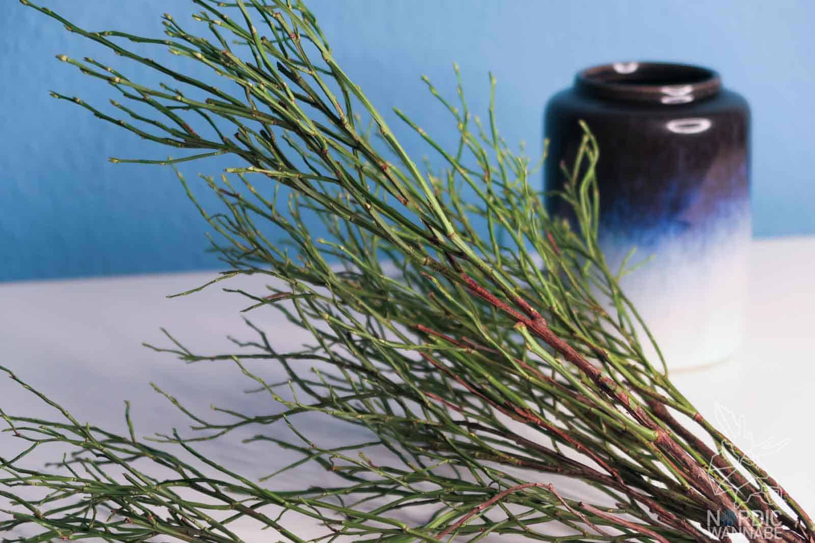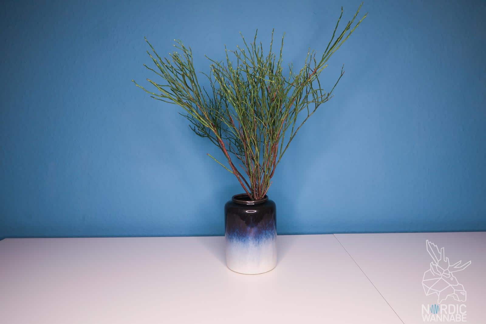 Das Ganze ist ziemlich unspektakulär. Die Zweige stehen für sich allein. Ich würde sie nicht schmücken, um den natürlichen Charme zu behalten. Sie kommen einfach mit etwas Wasser in die Vase und das war es schon. Die Vase kann aus Glas sein, aber ich würde eine aus Porzellan oder Keramik nehmen, weil die Wurzeln nicht so doll aussehen. Oder Ihr entfernt die groben Wurzeln einfach und steckt die einzelnen Zweige in eine Glasvase. Schaut beim Kaufen, ob Ihr auch unterschiedliche Farben bekommen könnt. Ich konnte zwischen braun und grün wählen. Das ist mein Tipp für Hygge & Ostern. Hoffentlich war es eine kleine Inspiration für Euch. Die Blaubeerzweige sind unaufgeregt – aber wunderschön – nordisch.
