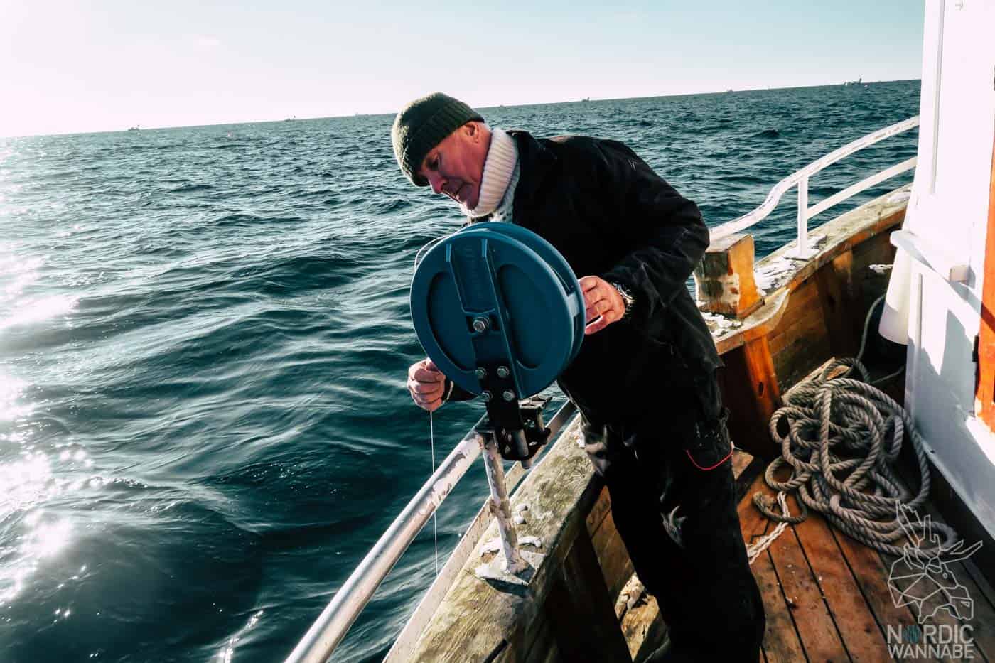 Es gibt zwar auch kleine Trawler, die den Fisch mit Netzen angeln. Aber viele kleine Fischerboote fischen noch den Skrei per Hand. Das sorgt dafür, dass der Fisch unversehrt und schonend gefischt wird. Das Ganze ist simpler als ich dachte. Wir durften es selber ausprobieren. Mithilfe einer Rolle und einer langen Angelschnur wurde gefischt. Ich war sehr überrascht, dass wir keinen Köder brauchten. Man nutzt einfach einen Metall-Haken, der 50 bis 80 Meter tief im Wasser versenkt wird und dann zieht man diesen ruckartig ein wenig hoch. Durch diese Bewegung erweckt man beim Skrei den Eindruck, dass was im Wasser schwimmt und er beißt an. Und so war es dann auch bei uns.