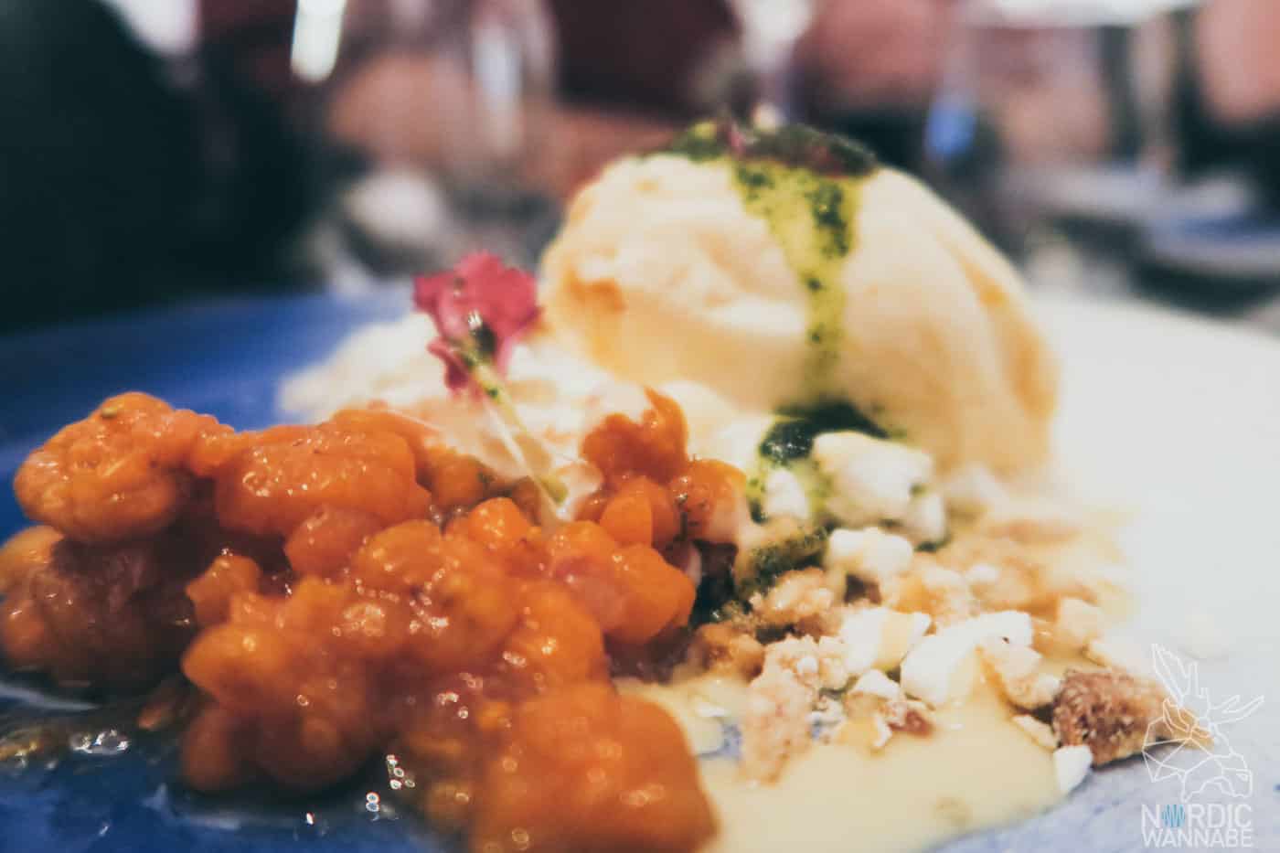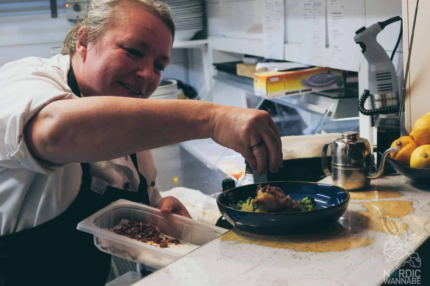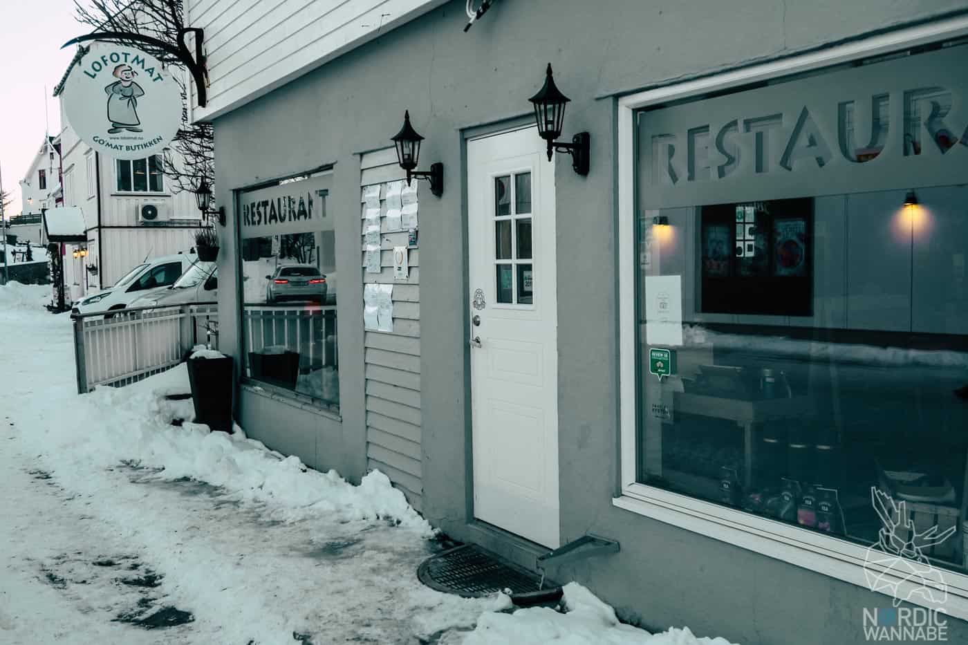 Den Fang des Tages haben wir uns am selben, zweiten Abend von dem norwegischen Meisterkoch Roy Magne Berglund zubereiten lassen. – Doch zuvor am ersten Abend waren wir im kleinen Restaurant Lofotmat von Siv Hilde in Henningsvær zu Gast, die uns zusammen mit Ihrem Mann viele Köstlichkeiten geboten hat. Siv ist weit über die Grenzen Norwegens bekannt, sie kochte bereits auf der Grünen Woche in Berlin für das Land Norwegen. Neben dem Kochen, singt sie auch mal ganz gerne in der Küche. In dem Restaurant werden hauptsächlich lokale Zutaten verarbeitet. Wir hatten zum Start kleine Häppchen mit Skrei-Rogen, dann knusprig panierte Zungen, gratinierten Stockfisch und natürlich leckeres Skrei-Filet mit Erbsen-Püree. Zum Nachtisch gab es Moltebeeren mit Eis. Ein Traum.