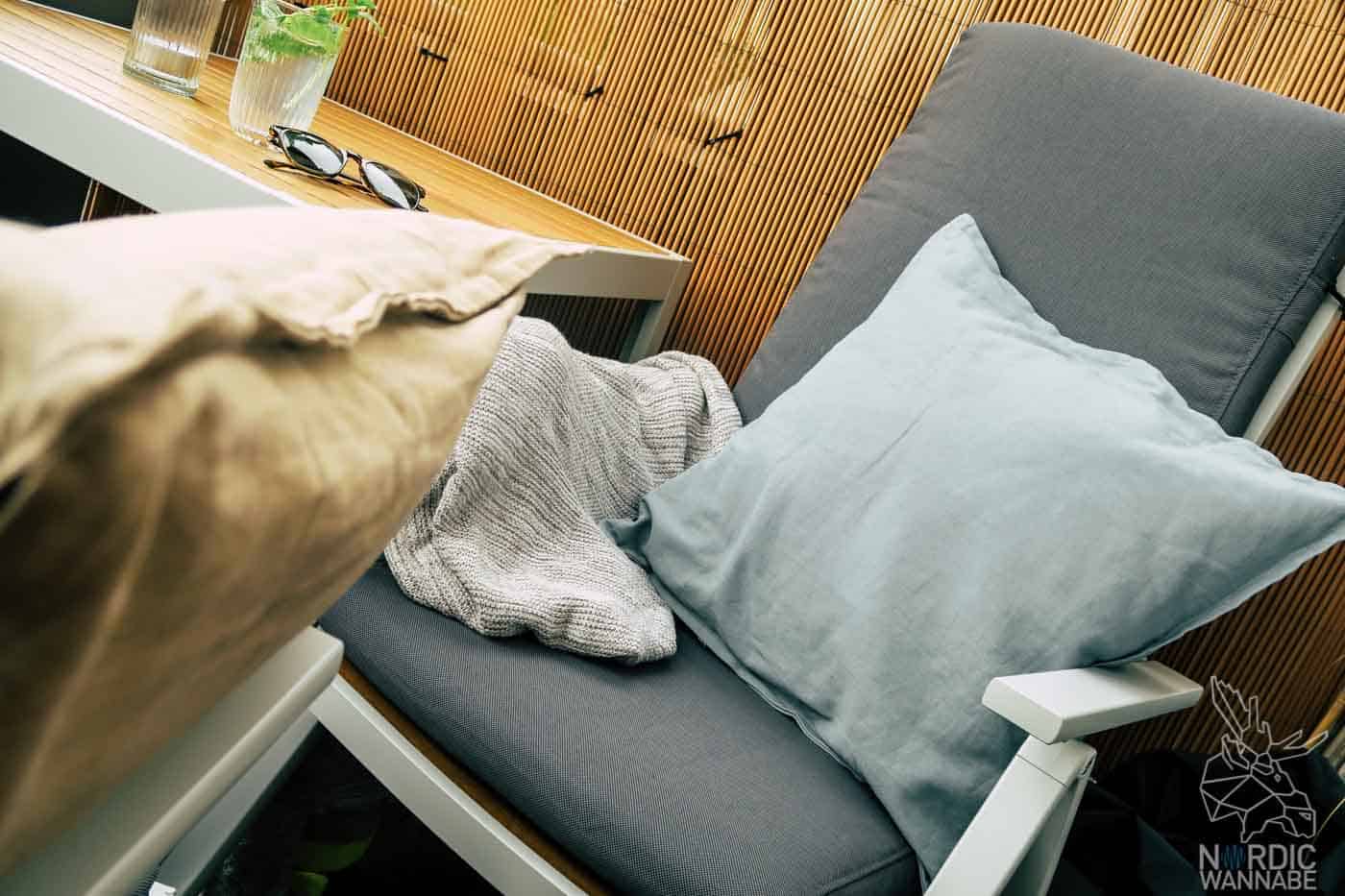 Ich musste etwas an meinem Balkon ändern. Die Sitzmöbel waren nicht mehr so gemütlich, waren viel zu tief von der Sitzhöhe her, haben geknarrt und waren schon etwas grün vom Moos. Also bin ich zu einem großen schwedischen Möbelhaus gefahren und habe mir dort einen neuen Tisch und zwei Stühle zugelegt. Mir war eine Holz-Optik wichtig, weil der Boden auch aus Holz ist. Ebenso wollte ich was Stabiles haben und habe mich für ein Gestell aus Aluminium entschieden. Die Tischplatte ist aus Eukalyptusholzlatten und es sieht sehr hochwertig aus. Die Stühle sind bequem dank der hohen Rückenlehne, die sich verstellen lässt. Um es etwas gemütlicher zu gestalten, habe ich mich für beige und hellblaue Kissen entschieden. Sie wirken leicht und setzen sich von den dunklen Polstern ab. Ich wollte extra keine knalligen Farben nehmen, damit der Skandi-Look schlicht aussieht. Für die Abendstunden habe ich mir eine leichte Decke über die Armlehne gelegt.