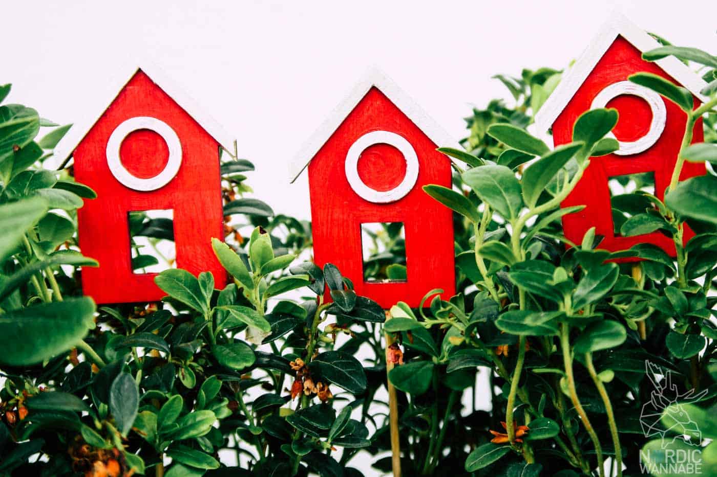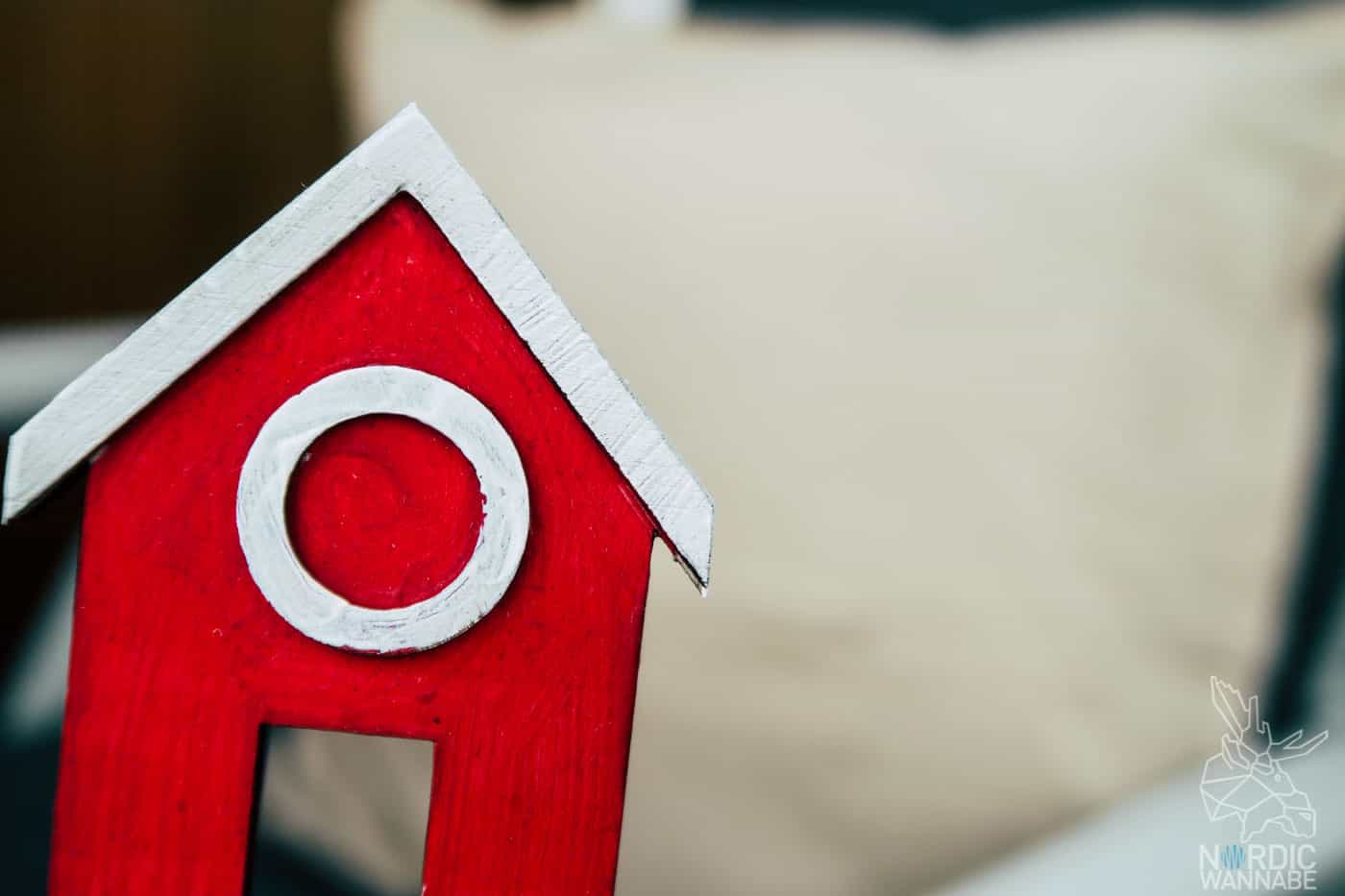 Natürlich verdienen auch unsere Balkonkästen einen Skandi-Look. Ich habe mal meine DIY-Fähigkeiten ausprobiert und mir im Blumenladen drei kleine Holzhäuser an einem kleinen Holzstab gekauft. Die Form gefiel mir, aber die Farben haben mich nicht so angesprochen. Deshalb habe ich mir dann im Baumarkt einen kleinen Pinsel und die Farben Rot und Weiß besorgt und mir aus den kleinen Häusern dann Schwedenhäuser gemacht. Die Häuser sind bestimmt nicht wasserfest, da müsste dann noch ein Lack drüber oder so. Aber dafür sind meine DIY-Kenntnisse dann doch zu begrenzt. Vielleicht hilft Haarspray? Egal, im Blumenkasten sehen die Häuser gut aus und sorgen für etwas Skandi-Look für den Balkon.
