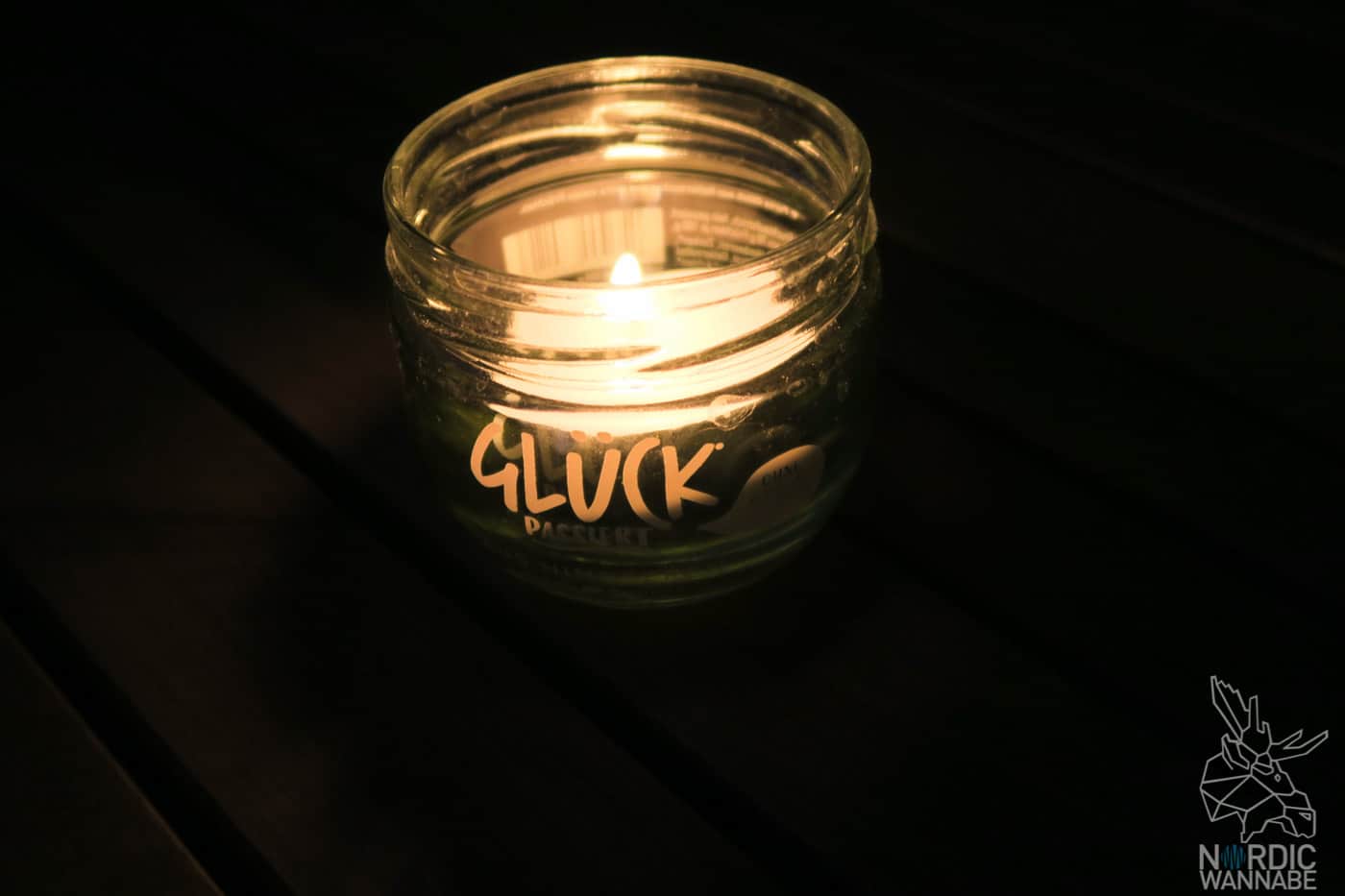 Wer auf Kerzenlicht steht, was richtig hyggelig ist, kann sich ein Windlicht auf den Balkon oder die Terrasse stellen. Ich möchte Euch hier drei Varianten zeigen. Das erste Windlicht ist wohl das Günstigste, denn es ist ein Marmeladenglas. Jeder von uns hat alte Gläser zu hause, oder? Einfach das Glas auswaschen, Teelicht rein und fertig.