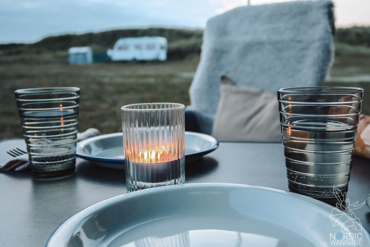 Sand, Meer, Muscheln,… Mit dem Auto oder Wohnmobil direkt bis ans Wasser? Das habe ich noch nie erlebt. Aber es war so schön. Das Wetter war perfekt, die Sonne schien, es war etwas windig und ich konnte wirklich mal die Seele baumeln lassen. Mehr Hygge geht nicht, oder? Und der Strand war so sauber. Ich hatte schon Befürchtungen, dass jeder seinen Müll dort liegen lässt, aber das war definitiv nicht der Fall. Sehr gut! Man sollte allerdings erfahrend sein beim Parken auf dem Sand, denn es kann passieren, dass man sich festfährt. Dazu aber später in einem Artikel mehr. Doch kommen wir zurück zur Hygge, dem dänischen Lebensgefühl. Schnell habe ich die Camping-Möbel aufgestellt, Kissen auf die Stühle, Fell-Imitate und meine Becher von Design-Letters mit „HEY*“ und „PAUSE*„. Diese dänischen Becher mit den bekannten Arne Jacobsen-Buchstaben könnt Ihr übrigens direkt bei NordicNest bestellen und meinen Blog unterstützen.