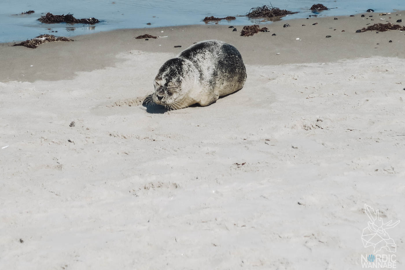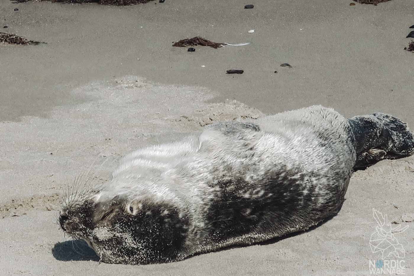 OMG!!!! Kleine Seehunde aka Robben! Wieso hat mir das niemand im Vorfeld gesagt? Ich liebe Seehunde. Doch fangen wir vorne an. Nach einer kleinen Wanderung durch die Sanddünen mit Sanddorn-Sträuchern erreichte ich den Strand. Schon von weiten konnte man eine Menschentraube erkennen. Schnell wurde auch der Grund klar: Dort lag eine kleine Robbe am Stand. Da sie sich zunächst nicht bewegte, befürchtete ich schon, dass sie tot sei. Aber sie lag nur in der Sonne und gönnte sich ein Sonnenbad. Ganz wichtig bei kleinen Robben und generell Sehhunden ist, dass man sie auf keinen Fall berührt, denn sonst erkennen die Eltern das Jungtier nicht mehr und es sind halt auch Wildtiere. Deshalb gab es eine Linie im Sand, die die kleinen Heuler schützen sollte.