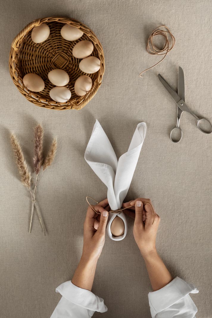 Eier gehören zu Ostern, wie Sterne zu Weihnachten. – Sucht Ihr noch eine tolle Idee, wie Ihr Euren Tisch zu Ostern dekorieren könnt? H&M Home hat da ein kleines Tutorial erstellt. Ihr braucht eine Serviette, hart gekochte Eier, ein dickeres Band und optional könnt Ihr noch Gräser als Deko nutzen. Los geht’s: