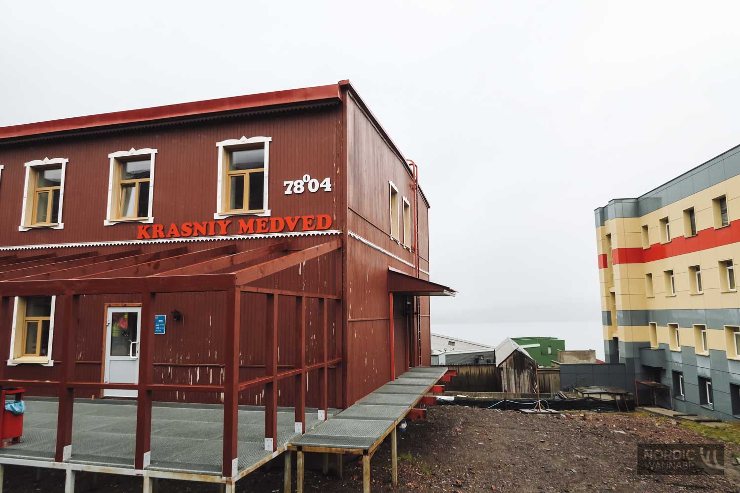Nach etwa einer Stunde wurde das Stottern des Schiffmotors ruhiger, das Ufer kam näher. Wir waren angekommen in Barensburg. Anders als der Name vermuten lässt, steht hier keine Burg. Viel mehr ist es eine Siedlung für die Menschen, die hier im Kohlebergbau für ein russisches Unternehmen arbeiten. Es geht vom Hafen eine schmale Treppe hinauf. Es regnet in Strömen. Sehen deshalb die ersten Häuser, die an verlassene Ruinen erinnern, nicht so einladend aus oder woran liegt es? Es ist kalt, trist und nass. Aber ich mache das beste daraus. Schließlich würde ich hier vielleicht nie wieder herkommen. Nun musste alles ganz schnell gehen. Der Aufenthalt in der Siedlung war kurz. Wir wurden umhergeführt.